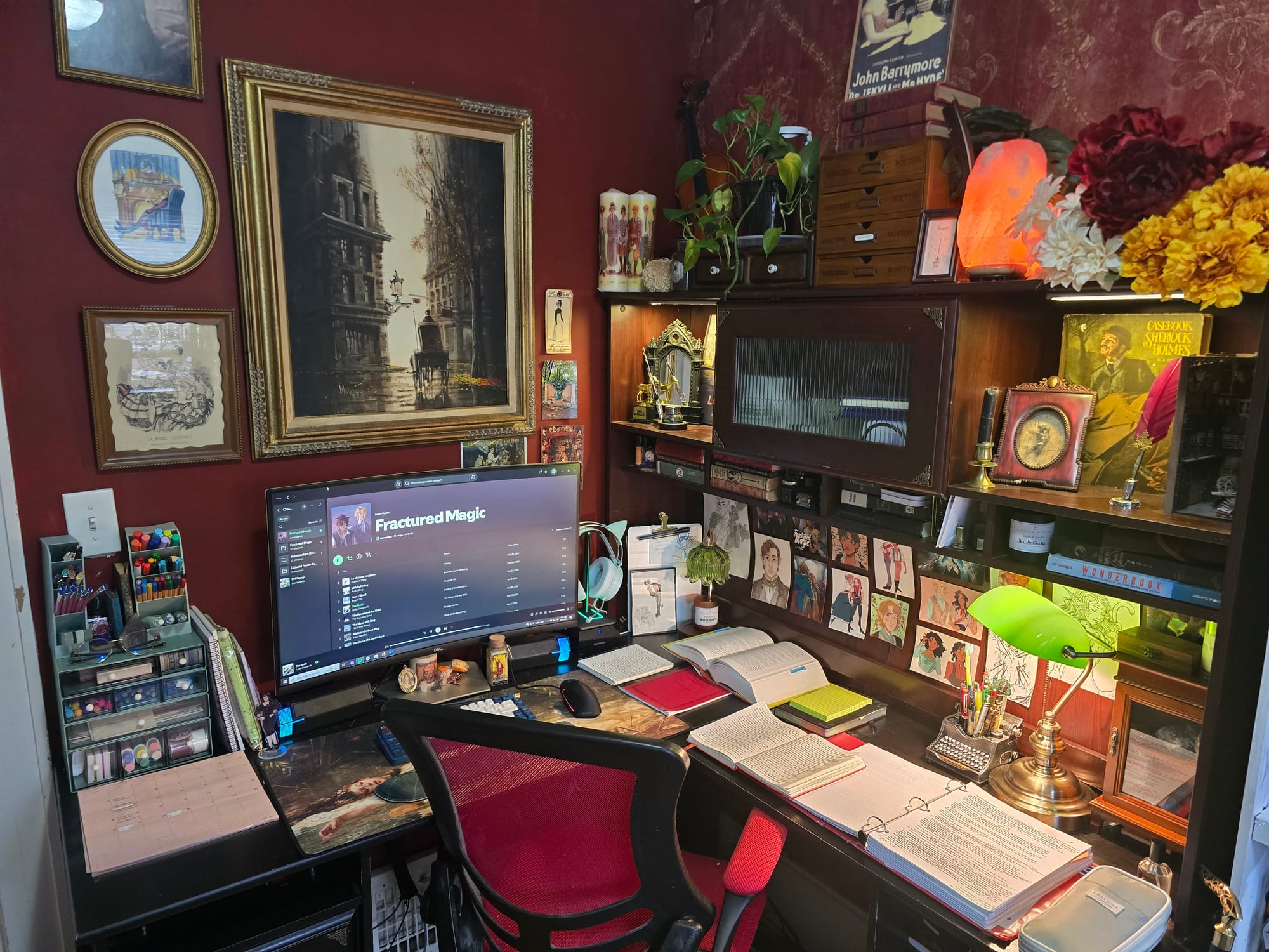 This is my office, complete with my Fractured Magic binder and drafting journal, my Fractured Magic playlist, and my wall of Fractured Magic art commissions.